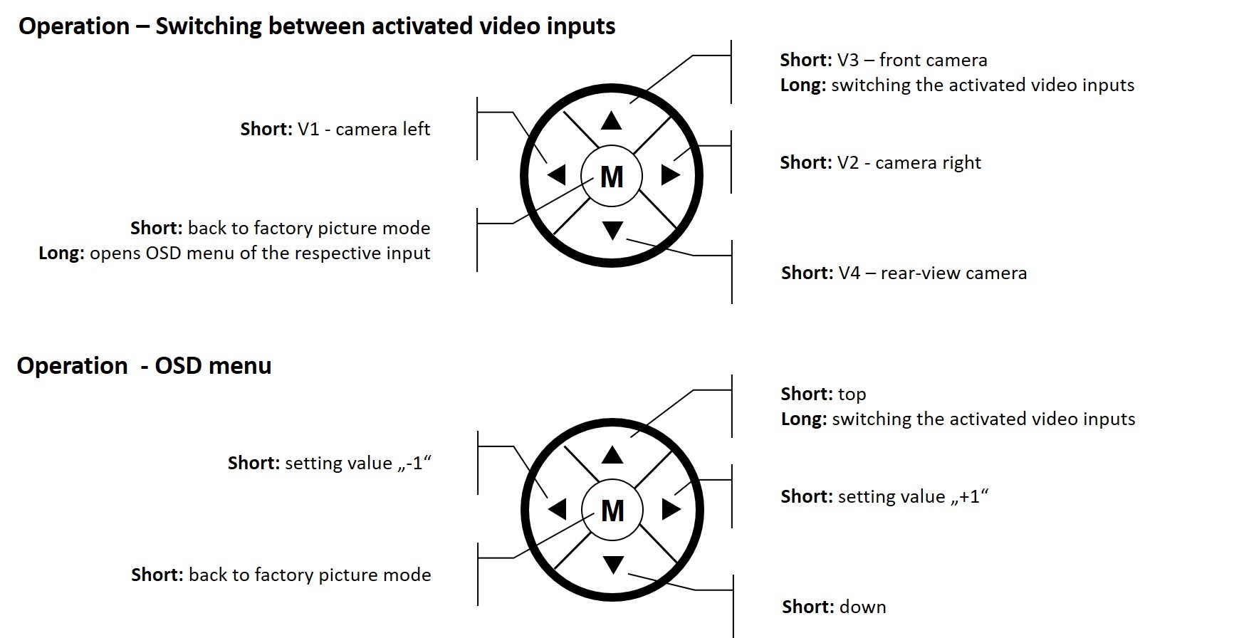 Mit der Fernbedienung kann man bequem das OSD-Menü des jeweiligen Videoeingangs aufrufen und die Einstellungen ändern, ohne die versenkten Tasten auf der Rückseite der Interface-Box umständlich bedienen zu müssen. Ist die Fernbedienung im Fahrzeug eingebaut, sind auch nachträgliche Änderungen der Einstellungen problemlos möglich, auch wenn die Interface-Box unzugänglich installiert wurde.