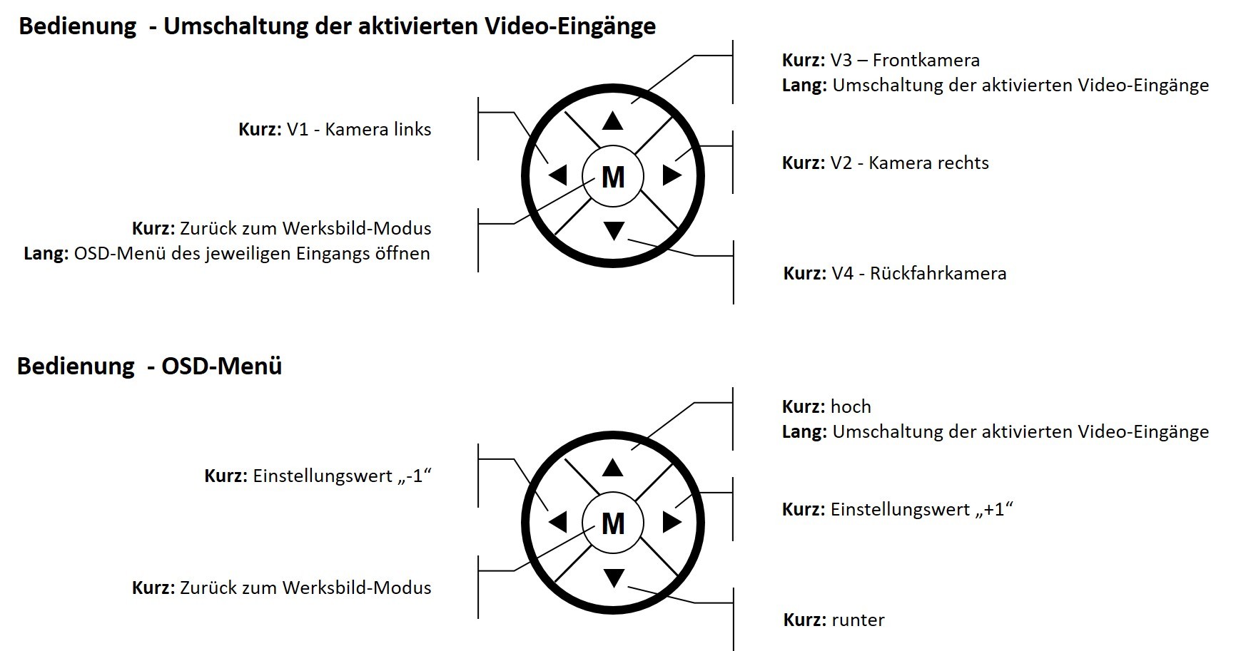 - Zur direkten Anwahl der Video-/Kameraeingänge und Änderung der Einstellungen in den OSD-Menüs