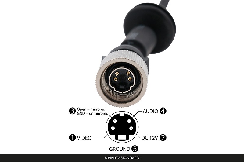 Der 4-Pin Mini-DIN Systemanschluss mit CV-Belegung kann direkt an einige Monitore für Rückfahrsysteme MR-xxx angeschlossen werden. Für den Betrieb an anderen Produkten ist zusätzlich der Adapter auf Cinch mit der Artikelnummer CAB-4P-RCA notwendig, der auch separat bestellt werden muss.
